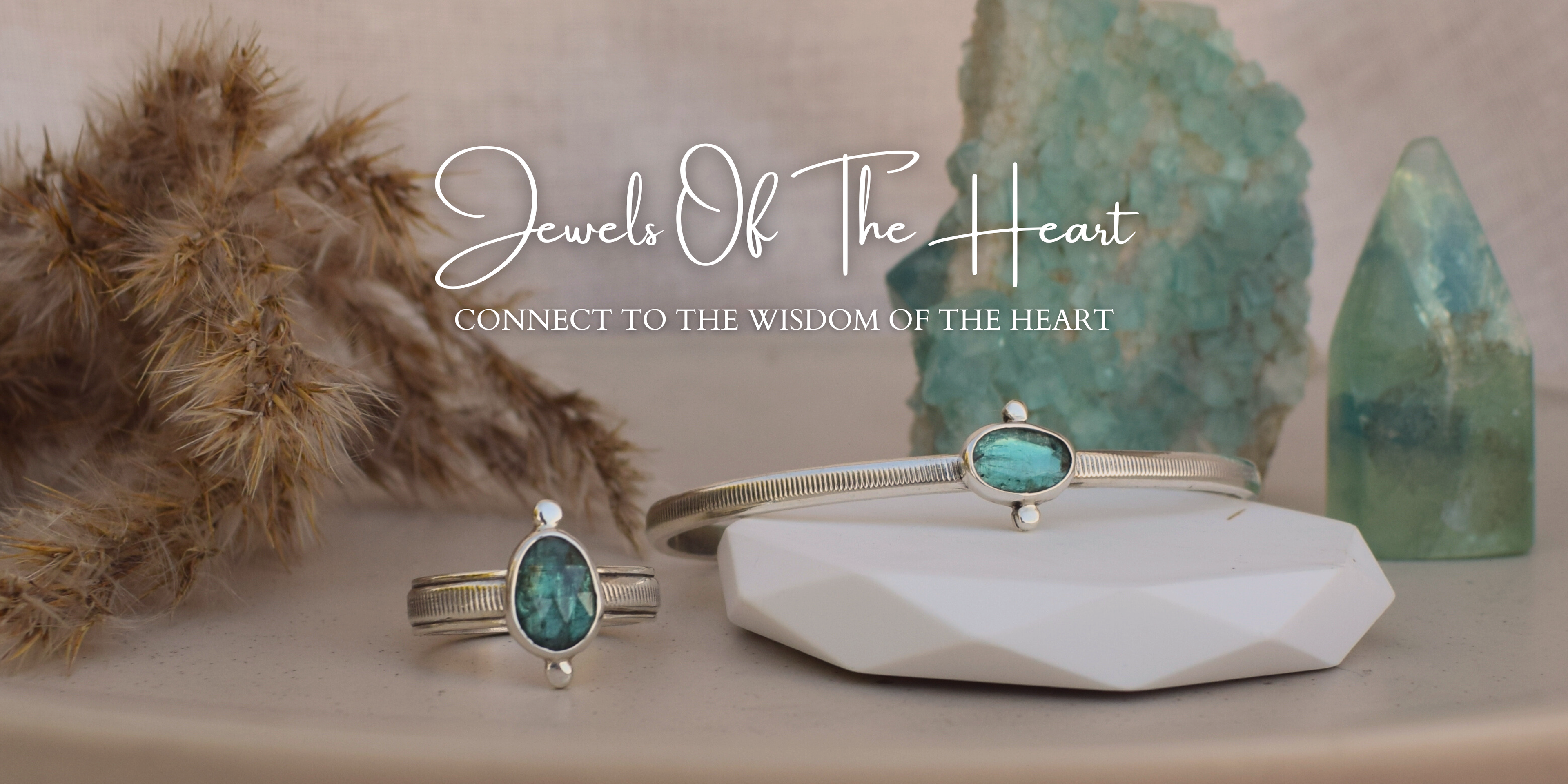 Handmade in sterling silver and set with teal and emerald green kyanite, every design reflects a different aspect of the heart’s path: softening, listening, rising, and grounding into your inner wisdom. From flowing necklaces that encourage openness, to cuffs and rings that support focus and presence, these pieces are made to hold space for your own becoming.