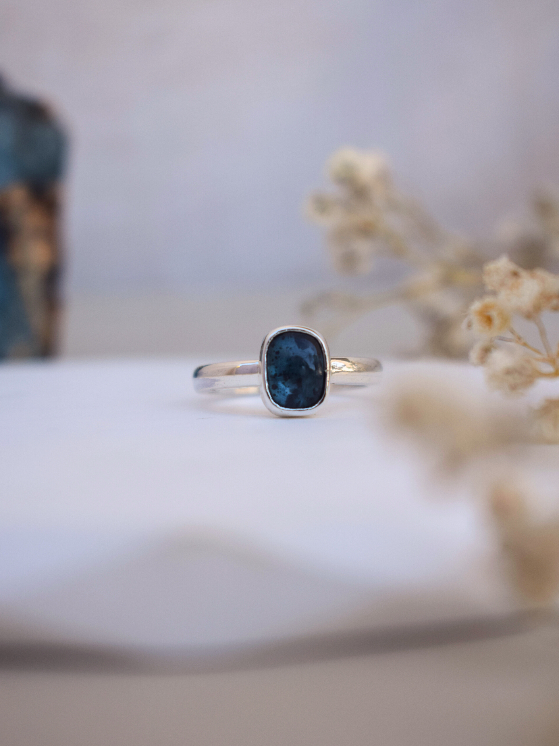 The Lunor Ring is a quiet companion for returning to stillness. Handcrafted in sterling silver with a single teal kyanite on a clean, thick band, it helps soften the noise of the mind and illuminates the spaces that keep your energy restless. This piece is a gentle reminder to pause, listen inward, and allow your heart’s wisdom to rise.
