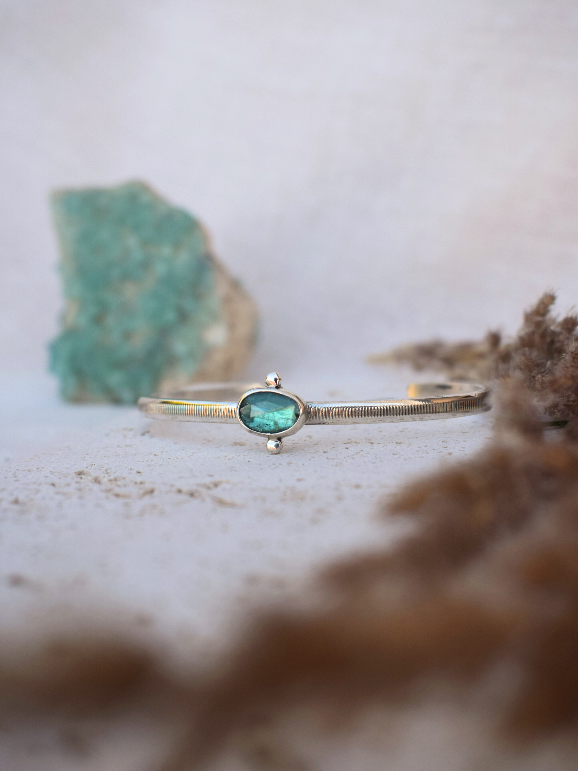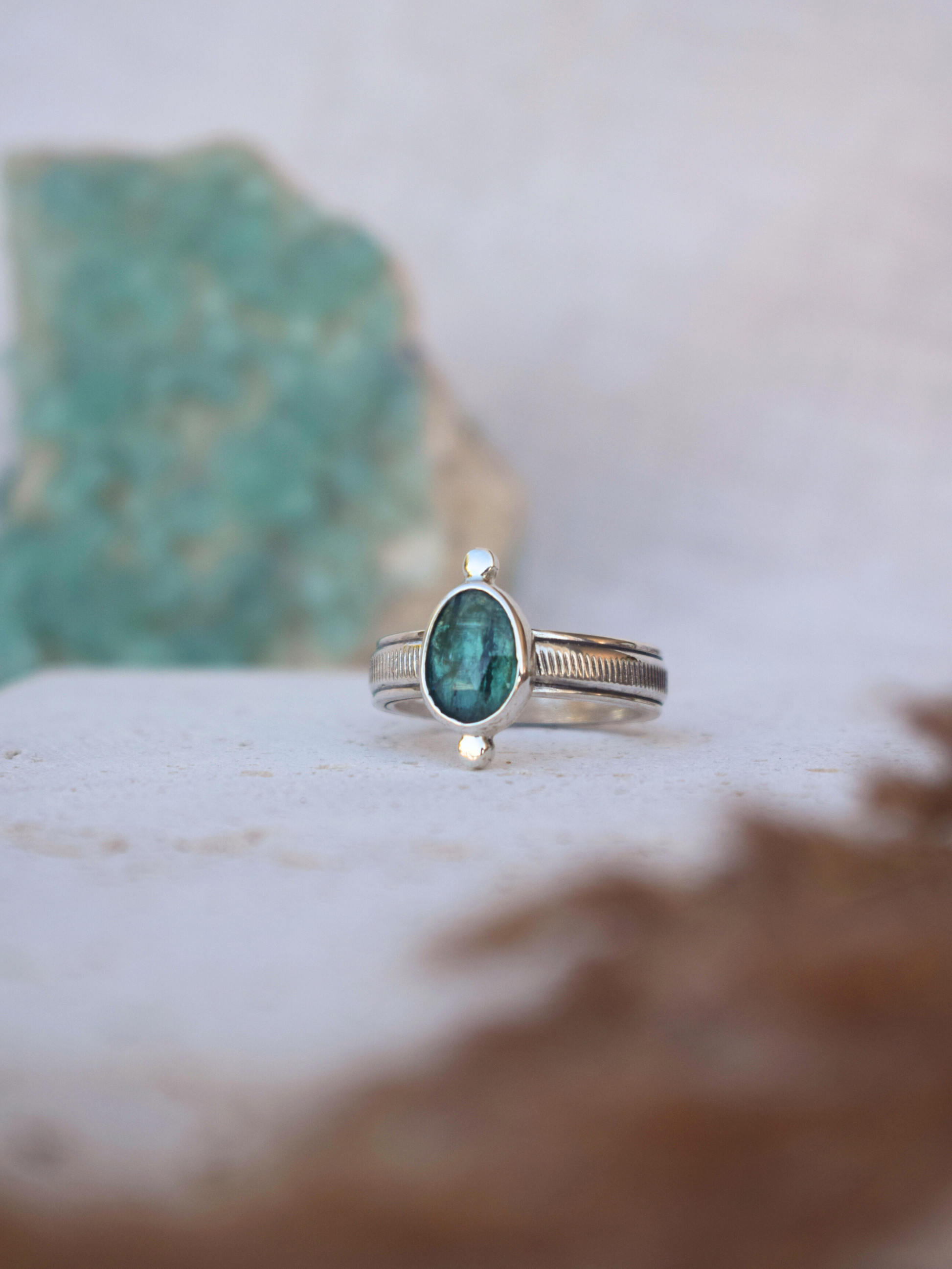 The Veyra Ring is a grounding talisman, handcrafted in sterling silver with a thick, textured band and set with emerald green kyanite. Its solid presence embodies stability, anchoring you in the energy of the heart. This piece is a reminder of the unshakeable strength that rises when you connect to your own inner center, offering support, resilience, and rootedness in every moment.